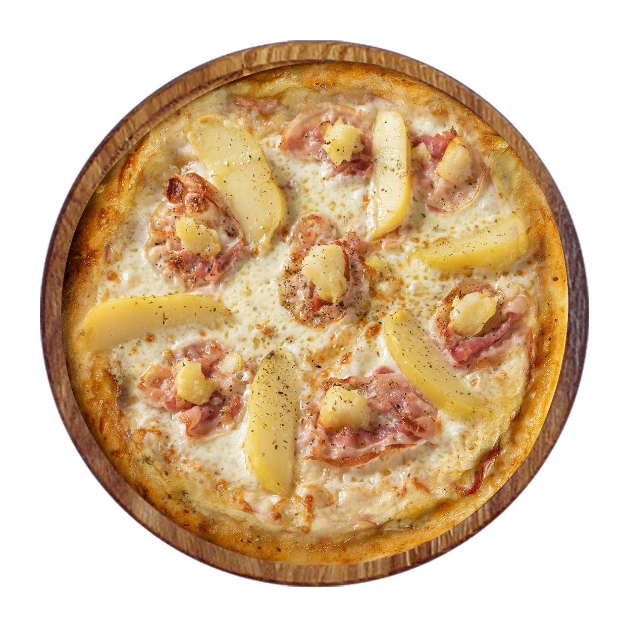 Crème fraîche, mozzarella, délice de dinde, pommes de terre, oignons, origan.