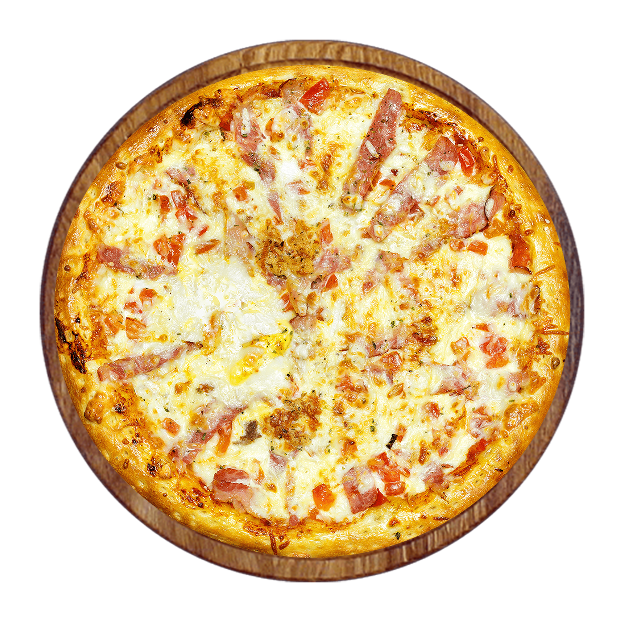 Crème fraîche, mozzarella, allumettes de veau fumé, oignons, oeuf, origan.
