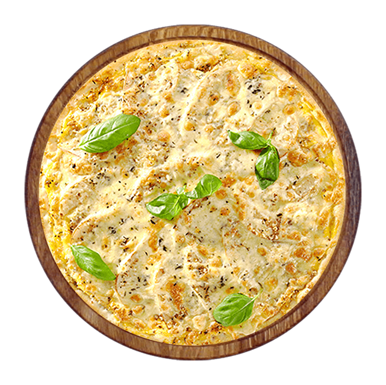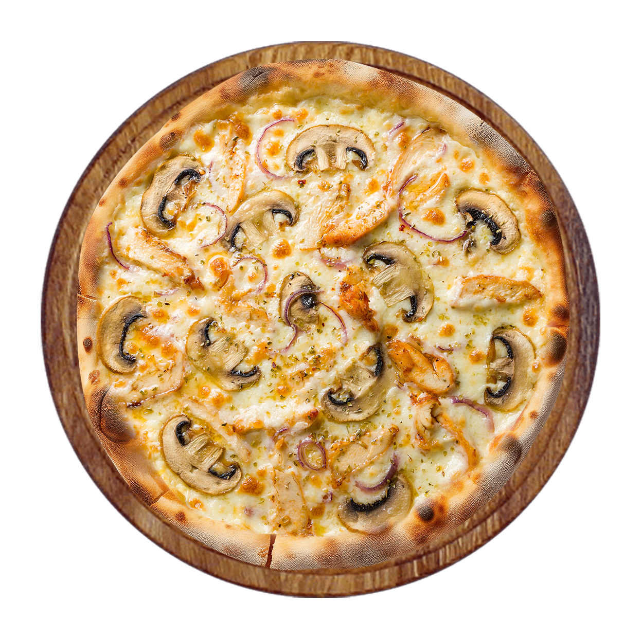 Crème fraîche, mozzarella, poulet en tranche, champignons, pommes de terre, origan.