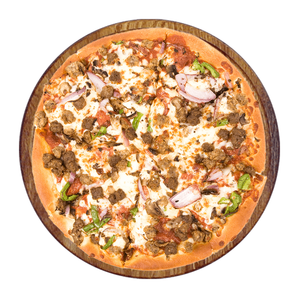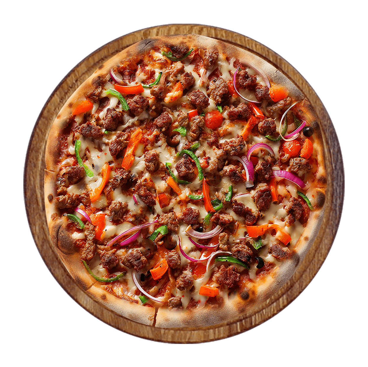Crème fraîche, mozzarella, viande hachée, boursin, oignons, origan.