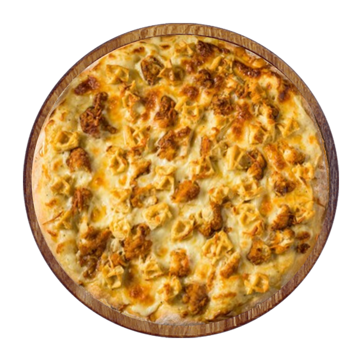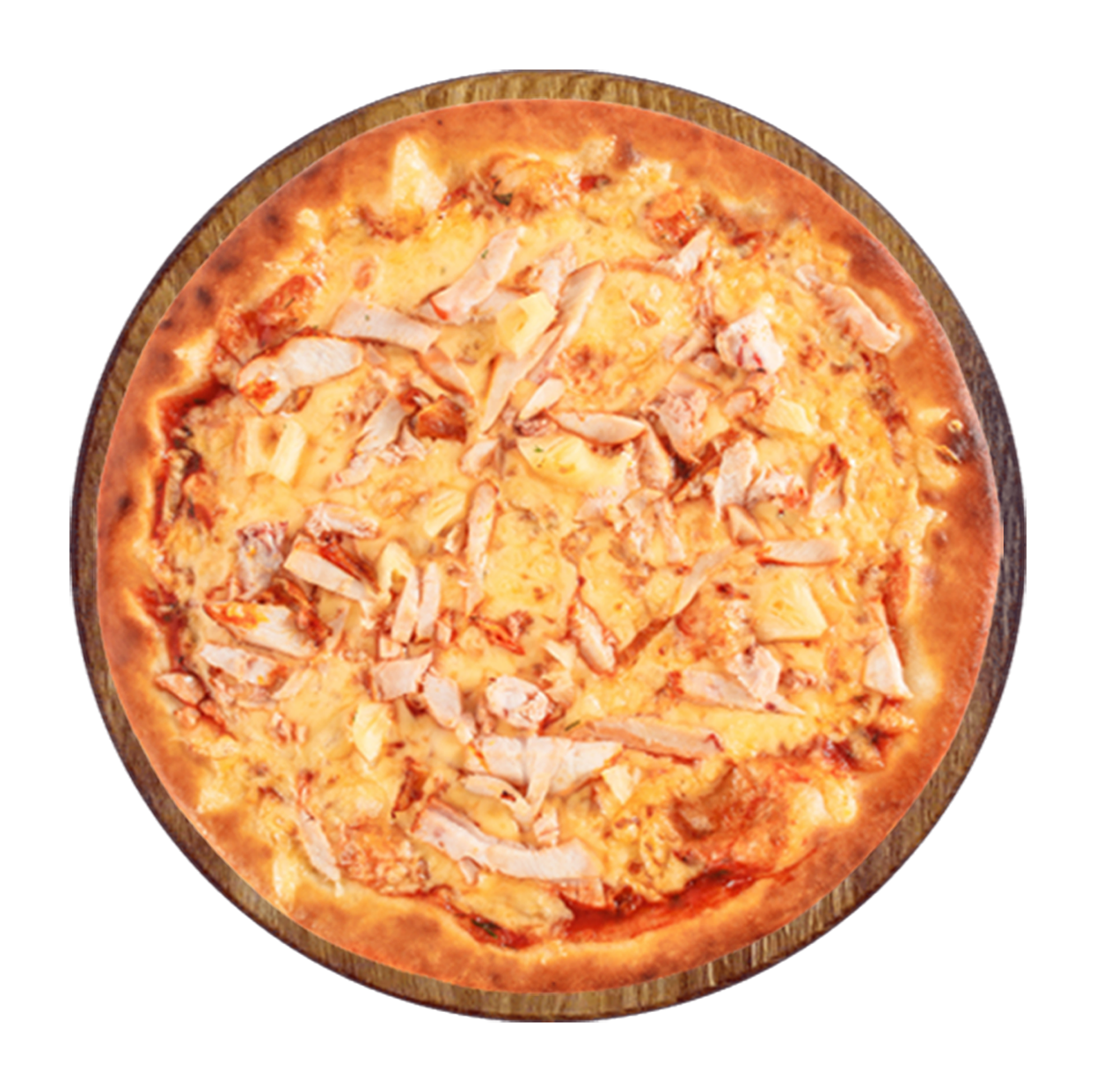 Crème fraîche, mozzarella, curry doux, poulet tikka, émincé de poulet, poivrons, oignons, origan, sauce chili thaï.